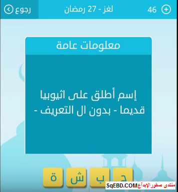 حل سؤال اسم اطلق علي اثيوبيا قديما بدون ال التعريف 27 رمضان من لعبة رشفة رمضانية صقور الإبدآع