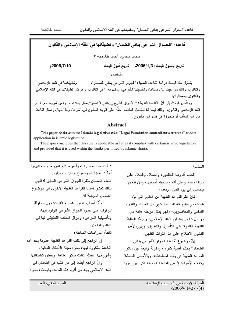 قاعدة الجواز الشرعي ينافي الضمان وتطبيقاتها في الفقه الإسلامي والقانون Pdf