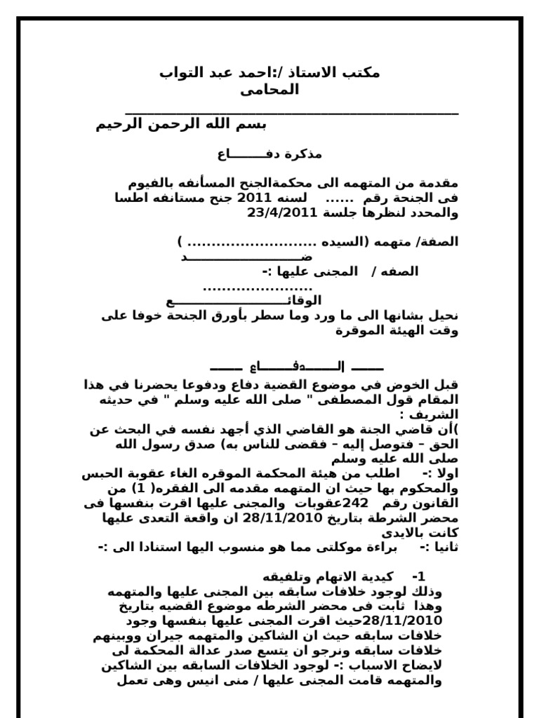 صيغة ونموذج كتابة مذكرة دفاع استشارات قانونية مجانية