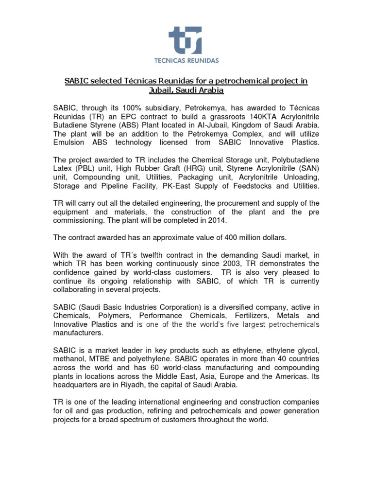 Sabic Selected Tecnicas Reunidas For A Petrochemical Project In Jubail Saudi Arabia